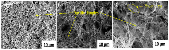 As the temperature decreased, the tensile strength and hardness decreased. When the sample was subjected to external force, the elastic strain accumulated continuously. When the sample overcame the bonding force between the second phase particles and the matrix, a new surface was formed. Finally, a dimple-like fracture morphology was formed. The tensile fracture microstructures of the three samples at different temperatures are shown in Figure 13.