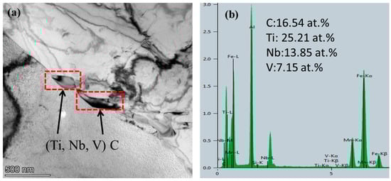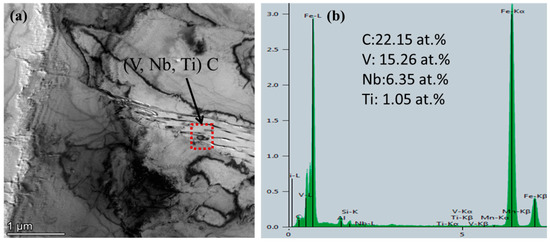 Images of (V, Nb, Ti) C precipitates in the experimental steel at 650 °C for five passes of thermal simulation. Images of (a) (V, Nb, Ti) C precipitates and (b) EDS of Nb, V, and Ti.