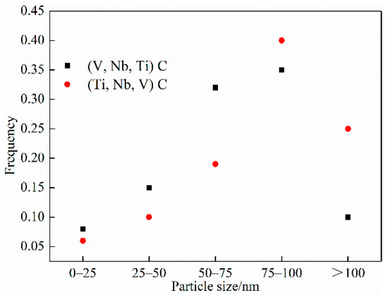 σp is the precipitation strengthening increment (MPa); f is the volume fraction of carbides (%); dp is the average diameter of the precipitate particles (nm). It can be seen from formula (3) that the more precipitated It can be seen from formula (3) that the more precipitated phases and the finer the particles the more obvious the strengthening effect and the greater the strengthening contribution to the steel. Taking into account the inconsistency of precipitation distribution and the inability of statistics for some small precipitations, the precipitation effect can only be analyzed qualitatively, and the amount of precipitation enhancement cannot be quantitatively analyzed. The precipitation of (V, Nb, Ti) C was mainly distributed on the ferrite matrix, and the particle size was between 50–100 nm. The size of (Ti, Nb, V) C precipitates greater than 75 nm accounted for about 65% precipitates near the boundary. Through the statistical analysis, (V, Nb, Ti) C had a higher volume fraction of fine precipitates in the steel, and the precipitation strengthening of the steel was greater. According to [29,30], Nb nano precipitates mainly formed during rolling and cooling at austenite grain boundaries or ferrite matrix.
