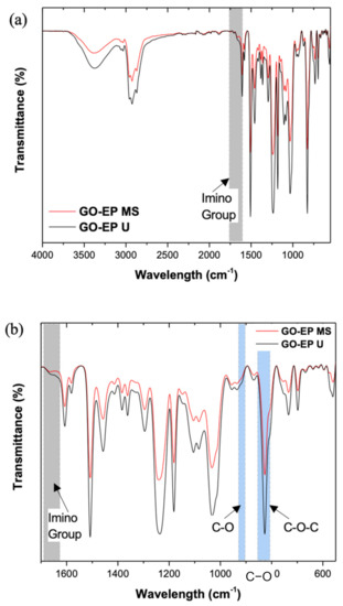 FTIR spectra of GO−EP U and GO−EP MS (a) Overall and (b) Zoomed in spectra.