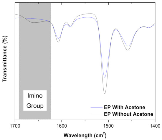 FTIR analysis was performed to investigate the changes in the chemical bonds of GO−EP prepared by different processing methods. Figure 2a,b show the FTIR spectrum of GO−EP U and GO−EP MS. The difference in intensity of the characteristic bands especially around 917 cm−1 and 828 cm−1 (stretching vibrations of C−O and C−O−C in the epoxide group respectively marked in blue) indicate that the amount of uncured epoxy groups varies between samples [23]. GO−EP U contains a higher amount of uncured epoxy groups as denoted by the increased band intensity (Figure 2b) which is attributed to the influence of solvent in the curing kinetics of the epoxy resin caused by the interactions between reactants. Based on Figure 2a, it is evident that most of the functional groups are retained regardless of the participation of acetone in the processing of GO−EP nanocomposite. To imply that acetone is completely removed from the GO−EP U, all absorption peaks demonstrated in GO−EP U should be similar to GO−EP MS [19,23]. However, the FTIR results show that a sharp splitting of the imino group that is present in GO−EP MS at 1650 cm−1 is widened in GO−EP U [23,24]. The results suggest that the participation of acetone in the preparation of GO−EP nanocomposite coating reduces the formation of the imino groups in the cured layer. To justify the role of acetone in the curing behaviour of epoxy coatings, the FTIR curves for bare epoxy with and without acetone were obtained and displayed in Figure 3. As marked by the grey box in Figure 3, the bend at 1650 cm−1 for epoxy coating without acetone disappeared in an epoxy coating containing acetone (16 wt% EP). Therefore, the presence of acetone in the preparation of epoxy coatings was proven to hinder the formation of the imino groups during curing.
