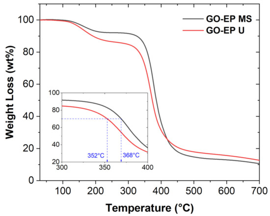 Therefore, the curing degree of both GO−EP U and GO−EP MS can be further validated by performing TGA analysis. The results of the report are depicted in Figure 4. The GO−EP U and GO−EP MS nanocomposite coatings undergo thermal degradation beginning at 124.98 °C and 126.2 °C with a mass loss of 1.5 wt% and 0.4 wt% respectively. The thermal degradation was followed by the maximum weight loss at onset temperatures of 336.7 °C and 351 °C for GO−EP U and GO−EP MS respectively. At this stage, the molecular chains began to decompose and the temperature to decompose 30 wt% of GO−EP U shifted to a lower region compared to GO−EP MS. This is ascribed to the presence of more unsaturated structures in GO−EP U, which had lower bond energies of aliphatic linkages that resulted in lower thermal stability. Hence, the processing method that requires GO to be ultrasonicated in acetone forms a nanocomposite coating that has a high number of low crosslinking areas due to the incomplete degree of curing. As demonstrated in the FTIR studies, the presence of acetone during the nanocomposite coating preparation hinders the formation of imino groups which lowers the curing kinetics of epoxy. This is consistent with the findings by Bilyeu et al. where the resistance of epoxy thermosets to thermal degradation is highly dependent on the degree of curing [25].