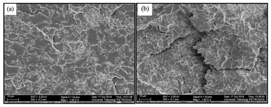 Therefore, the microscopic analysis was conducted on the fractured specimens of GO−EP MS and GO−EP U that are depicted in Figure 7a,b respectively. Based on Figure 7a, clusters of GO sheets appeared on the fractured surface of GO−EP MS, indicating that shear stirring did not provide sufficient exfoliation of GO sheets during the preparation stage. Meanwhile, the GO sheets in Figure 7b exist as individual sheets with sizes ranging below 2 µm. This indicates that the ultrasonication of GO sheets in acetone during sample preparation played a vital role in ensuring that the GO sheets are fully exfoliated within the epoxy matrix. According to the theory of the matrix to filler interaction, small−sized particles would elevate the formation of strong interface layers between the matrix/filler that enhances the reinforcement of a composite [22]. However, this theory could not explain the results from the mechanical tests conducted in this study as the large−sized GO aggregates in GO−EP MS provided better reinforcement than the exfoliated GO sheets in GO−EP U. Therefore, this finding confirms that the tensile strength of the nanocomposite coatings is highly influenced by the curing state of the epoxy matrix. GO−EP U contains fewer high−molecular−weight chains which allow the cracks to initiate and propagate within the unsaturated areas of the coating which explains the low tensile strength of GO−EP U. Acetone not only reduces the saturated structures in the matrix by preventing the formation of imino functional groups but also increases the chance for the escaped acetone to form inclusions and pores within the epoxy matrix which become point defects for failure during mechanical tests.
