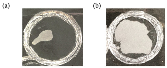 The coating failure after pull−off adhesion test on (a) GO−EP MS and (b) GO−EP U.