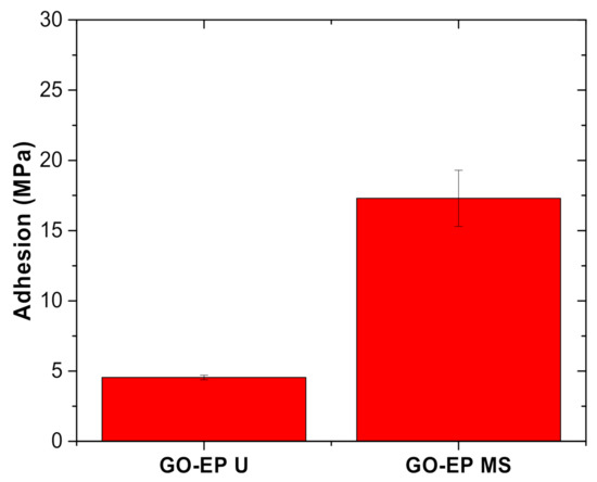 The adhesion strength of the prepared coating was measured to investigate the effect of including solvent in the preparation of GO−EP composite coating. Figure 8 shows the adhesive failure of GO−EP U and GO−EP MS. GO−EP MS outperforms GO−EP U by displaying a typical cohesive failure with a locus fracture within a small area of the coating. In contrast, GO−EP nanocomposite coating prepared by ultrasonication GO sheets in acetone (GO−EP U) presented a typical adhesive failure on the majority of the areas covered by the dolly. This shows that the participation of acetone in the preparation method weakens the adhesive force of epoxy resin as indicated by the low adhesion strength measured by the pull−off adhesion tester. The adhesion strength declined significantly from 13 MPa to 4.9 MPa when acetone was included (Figure 9). Concerning this, the depressive effect on the adhesive force of the coatings is influenced by the combination of the effect of internal stress and the lower number of bonds on the metal/coating interface. The interference of solvent during the preparation of coating reduced the amount of chemical bonding such as imino groups that can be postulated by the lower degree of cure which is also observed in other studies [23]. In addition to that, the internal stress caused by the changes in the physical and chemical characteristics during the curing process potentially affects the state of the coating during the tests. Therefore, the coating might experience severe shrinkage due to the evaporation of the residual acetone during the curing process, thus affecting the metal/coating interfacial force. Meanwhile, the excellent adhesion of GO−EP MS is believed to be contributed by the complete degree of curing of the coating resin.