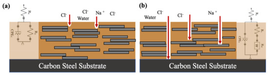 Schematic representation of the circuit model of three different scenarios (a) coating with high crosslinking areas (b) Coating that established conductive pathways through low cross−linking substrates that connect electrolyte to the substrate diffusion effects dominate corrosion) [33,34].