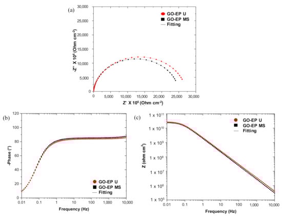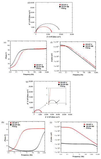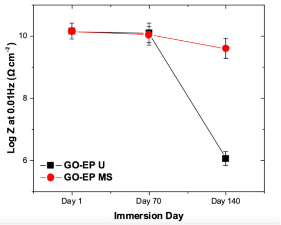 Compilation of |Z|0.01Hz values of GO−EP U and GO−EP MS from the EIS measurements after immersion in 3.5 wt% NaCl solution for 1, 70 and 140 days.