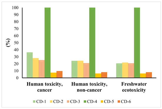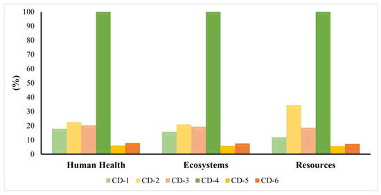 The evaluation of all the syntheses in respect of the landfill scenario (Figure 15) allowed us to understand that CD-5 has lower impacts and CD-4 was associated with higher environmental impacts. Once again, it was verified that CD-1, CD-2, and CD-3 have higher impacts on Human Health than in the Ecosystem category. This is expressively evident in CD-1, where differences between both subcategories of Human Health and the Human toxicity, cancer with Freshwater ecotoxicity were 12% and 14%, respectively. Thus, once again, when we compared the impacts of CD-1 considering the other methods, it was concluded that CD-1 presents less sustainability related to the ecotoxicity of chemicals.