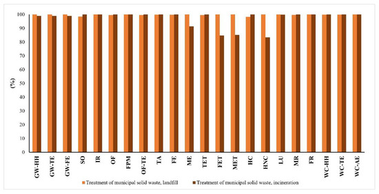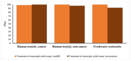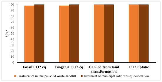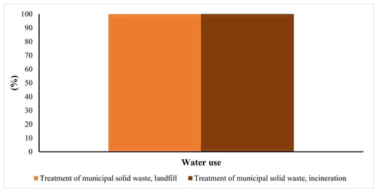 According to the synthesis with lower impacts in this method, an evaluation of the disposal scenario (Figure 12) was performed. This analysis permitted us to conclude that no significant differences exist between the disposal scenarios, despite landfill having slightly lower environmental impacts than incineration (a difference of 0.14%). Therefore, as verified in the previous method (Greenhouse Gas Protocol method), the landfill scenario appears to be more sustainable regarding CO2 emissions and water consumption.