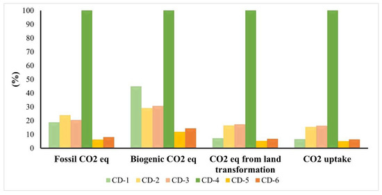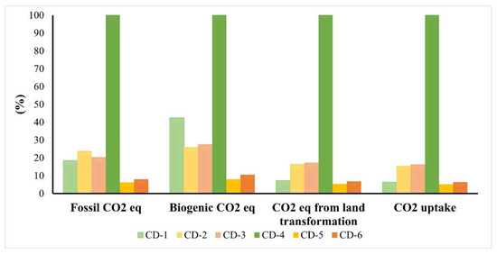 In the Greenhouse Gas Protocol, considering all the subcategories, it was noted that the impacts in CD-1 were higher in Biogenic CO2 and lower in CO2 uptake. Beyond this, Biogenic CO2 appears to be a key category in this method, since the environmental impacts were higher in all synthesized CDs.