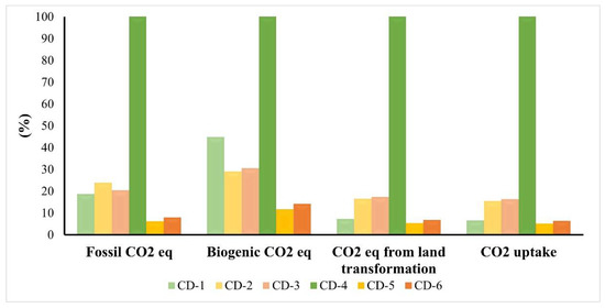 Comparing all the syntheses for the incineration scenario (Figure 6) it was possible to verify that CD-5 has lower environmental impacts and CD-4 is associated with the highest impacts, as we observed in the ReCiPe method. It was possible to observe that, for all the CDs, in the Biogenic CO2 category the impacts are higher when compared with the other categories. These differences are expressively higher in CD-1, in which the contributions rise between 26% and 38%. That allowed us to understand that in this method the Biogenic CO2 was a key category in CD syntheses, since the impacts of incineration have greater contributions, mainly in CD-1.