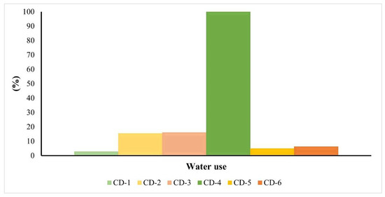 Comparing all the syntheses under study (Figure 9), the first conclusion was that CD-1 is associated with lower environmental impacts and CD-4 with the highest impacts. These synthesis routes performed a hydrothermal treatment of the precursors, and the major difference is that CD-1 consists of a high-yield synthesis. Furthermore, the carbon precursor in these syntheses is different (CD-1: glucose and CD-4: citric acid), which can also explain the difference (97%) in the potential environmental impacts. It is worth mentioning that this method allowed us to understand that, when we focus on the potential of water deprivation, the high-yield synthesis (CD-1) is more sustainable.