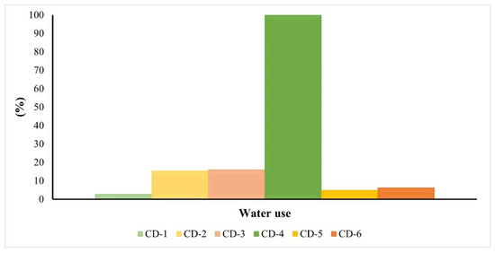 The results obtained by this method for each synthesis under study can be observed in Figure S8. It was possible to observe that for water use, the major contributor was electricity in CD-1 (with contributions of 76%) and CA in the remaining syntheses (CD-2: 78%, CD-3: 80%, CD-4: 84%, CD-5: 81%, and CD-6: 80%). In relation to the other synthesis inputs, it was possible to verify a trend (from the highest to the lowest contributor) of electricity > glucose > NaOH > H2O2 > H2O in CD-1 (Figure S8A), CA > EDA > electricity > H2O in CD-2 (Figure S8B), CA > urea > electricity > H2O in CD-3 (Figure S8C), CA > urea > H2O > electricity in CD-4 (Figure S8D), and CA > urea > electricity > H2O in CD-5 (Figure S8E) and CD-6 (Figure S8F). In general, it was possible to understand that CD-2, CD-3, CD-5, and CD-6 appear to have a similar trend, in which we have a carbon precursor as the higher contributor, followed by the N-containing small organic molecules (EDA or urea) and then, electricity and water. It is worth mentioning that in CD-4 and CD-6, water appears to have negligible impacts (less than 1%).