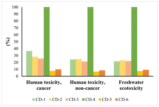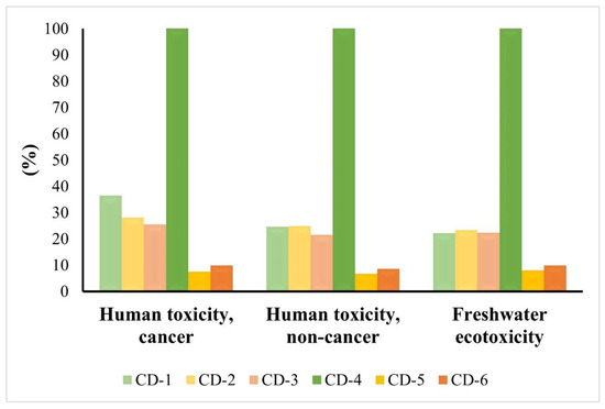 For the landfill scenario, it was also verified that the synthesis is responsible for more impacts than the disposal scenario in all the syntheses under study (Figure S3). In this sense, the synthesis potential environmental impacts vary between 87–100% for CD-1, 85–100% for CD-2, 84–100% for CD-3, 96–100% for CD-4, 61–100% for CD-5, and 67–100% for CD-6. For all the syntheses it was possible to understand that the disposal scenario has quite negligible impacts with some exceptions. In CD-1 and CD-3, these were in ME (CD-1: 4% and CD-3: 3%), FET (CD-1: 14% and CD-3: 16%), MET (CD-1: 13% and CD-3: 15%), and HNC (CD-1: 12% and CD-3: 13%). On the other hand, for CD-2 and CD-4, the exceptions were in FET (CD-2: 15% and CD-4: 4%), MET (CD-2: 14% and CD-4: 4%), and HNC (CD-2: 11% and CD-4: 3%). Finally, GW–HH (3% for both CDs), GW–TE (3% for both CDs), GW–FE (3% for both CDs), ME (CD-5: 9% and CD-6: 7%), FET (CD-5: 39% and CD-6: 33%), MET (CD-5: 38% and CD-6: 32%), HC (CD-5: 2%), and HNC (CD-5: 33% and CD-6: 28%) were the exceptions in CD-5 and CD-6.
