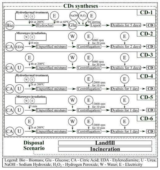 For this work, the environmental impacts were analyzed by using a weight-based functional unit of 1 kg, which means that 1 kg of produced CDs was considered. In this sense, it is possible to compare an equivalent amount of nanomaterials through the synthesis yield [55,56]. The synthesis yield of each CD under study can be viewed in Table 1.