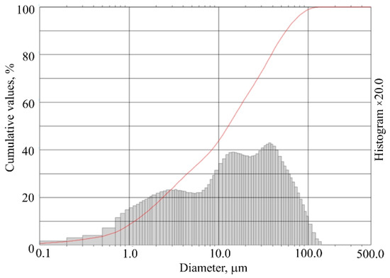 Quartz sand (M32 and M300) is composed of 99.5% silicate dioxide and 0.5% other admixtures (Al2O3, Fe2O3, TiO2, K2O, CaO). Quartz sand M300 from JSC “Anyksčių kvarcas”, Anyksciai, Lithuania is milled in a circular mill until it reaches a specific surface of 4400 cm2/g. The distribution of milled quartz sand particles by size is presented in Figure 2.