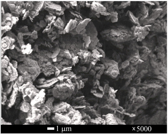 A microstructure image of MKA was obtained with the field emission scanning electron microscope (SEM) JSM-7600F (accelerating voltage—4.0 kV) (JEOL, Tokyo, Japan). An opportunity to research an uncovered electrically conductive layer surface and to perform an investigation of changes appearing on the chosen surface place due to the heating arises. Figure 4 shows that MKA consists of irregular shape plates.