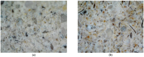 Sample C30 macrostructure zoomed in 12 times: (a) before fire effect; (b) after fire effect. Cement, MKA and milled quartz particle size determination research showed that used MKA average particle size is 15.34 μm, milled quartz sand is 17.66 μm, while cement is 21.71 μm.
