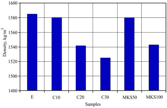 Compression strength research results showed that the C10, MKS50 and MKS100 sample compression strength was higher than E samples (Figure 13). The highest compression strength was determined in MKS50 samples, and it was 11.1% higher than in E samples. Similar results were obtained in both C10 and MKS100 samples. The determined compression strength in these samples was accordingly 9.1% and 4.3% higher than in E samples. C20 sample compression strength was lower by 4.9%. Noticeable sample compression strength lowering was observed in C30 samples, which reached 31.2%.