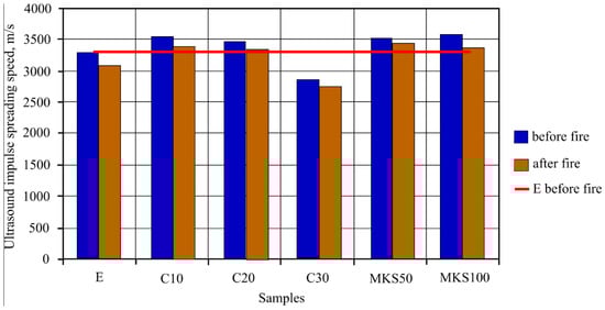 Ultrasound impulse splitting speed research was carried out, the results of which are shown in Figure 9. In samples C10 and C20, it was determined that ultrasound splitting speed was greater than E, while the C30 sample was lower by even 12.96%. MKS50 sample ultrasound splitting speed was the highest of all studied samples and 8.91% bigger than E. The MKS100 sample ultrasound splitting sound was slightly lower than MKS50 and C10; however, it was higher than E. After the fire effect was carried out in sample ultrasound impulse spreading speed research, result tendencies were similar to samples before the fire effect. C10 and C20 samples had ultrasound spreading speed that was higher than sample E, while the C30 sample speed was lower by 10.63%. In this case, the MKS50 sample determined ultrasound spreading speed was the highest out of all samples and higher than sample E by 11.82%. MKS100 sample ultrasound spreading speed was lower than MKS50 and C10; however, it was still higher than sample E.