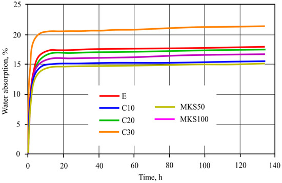 Sample absorption kinetics were determined and shown in Figure 10. Research results showed that C30 samples had the highest absorption, which after 134 h reached 21.35%. The smallest absorption was of MKS50 samples and was equal to 15.12%. All sample absorption, except for C30, when compared to E samples, was smaller.