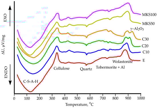 In samples C20 and C30, the cement amount was lower than in other samples. Taking into account that the main tobermorite amount depends on portlandite formed during cement hydration, then in C20 and C30 cases accordingly, this amount was lower. Previous DTG-TGA research showed that exothermic peaks were in the 920–930 °C temperature range. Ptáček [25] shows that at 925–1050 °C temperature, an amorphous SiO2 crystal balite separation takes place according to chemical Equation (12):