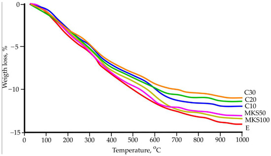 In the case of the MKS50 samples, MKA replaced 50% of milled quartz sand, while MKS100 sample case MKA changed the whole of quartz sand. The cement amount in these sample groups was the same when compared with E samples. DTG and TGA results did not show that MKA remained unreacted and had fulfilled its filler role. It was noted that the MKA amount in the case of MKS100 cement amount was about 26% when compared to the C20 case—25%. It can be assumed that the starting MKA reaction when forming tobermorite without using portlandite, while during hydrothermal hardening, milled quartz was more reactive than MKA, due to which during the C20 sample case there was a part of unused MKA. It can be concluded that when changing milled quartz sand, MKA was fully used for the microstructure formation, due to which there is no basis to state that it works as an aggregate.