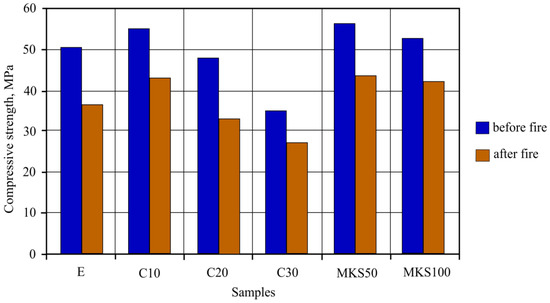 Compression strength experiment results after a fire effect can be explained after evaluating sample micro and macrostructure formation as well as main composite fiber cement component and hydrate behavior in high temperatures. The C10, MKS50 and MKS100 samples in regular conditions showed the best results. The C20 samples after the fire effect had the highest compression strength loss according to percentage—30.9%. Since these sample structure formations had milled quartz sand take place by filling micropores, at high temperatures, after polymorphic quartz change, dense microstructure should have weakened, lowering the whole material’s strength by doing so.