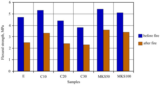 Bending strength sample results (Figure 14), as well as compression strength sample results, showed that C10, MKS50 and MKS100 sample bending strength was higher than E samples. The highest bending strength was determined in MKS50 samples as well, and it was 14.9% higher than in E samples. The C10 and MKS100 samples determined bending strength was accordingly 12.8% and 8.5% higher. The C20 sample bending strength was lower by 6.3%. The highest bending strength decrease was determined in C30 samples, which reached 19.1%.