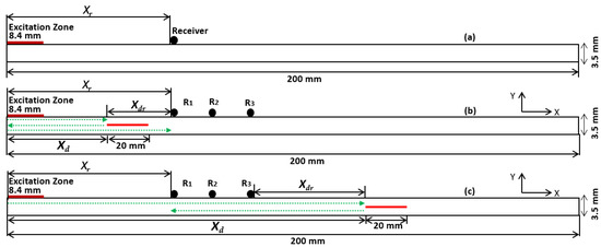 The defect-free CFRP plate is presented in Figure 1a. In case 1, the delamination is positioned in between the excitation zone and the receiver, as shown in Figure 1b. In case 2, the delamination is positioned after the receiver, as shown in Figure 1c.