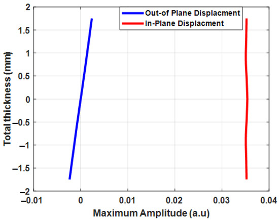 The in-plane and out-of-plane displacements of mode in a 3.5 mm-thick CFRP plate are presented in Figure 3. The maximum amplitude of in-plane displacements of mode at 100 kHz was relatively small compared to out-of-plane displacements of mode. Therefore, the maximum amplitude of out-of-plane displacements of the mode was dominant and relatively higher compared to in-plane displacements.
