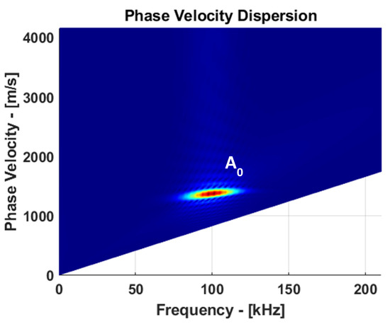 Guided wave analysis at 100 kHz is an appropriate way to achieve a good balance between dispersion, mode complexity, and attenuation. In order to properly identify mode, the signals on the surface of the plate were recorded and corresponding B-scan data were obtained. Using 2D Fourier transform, B-scan data were converted into phase velocity versus frequency domain, as presented in Figure 5.