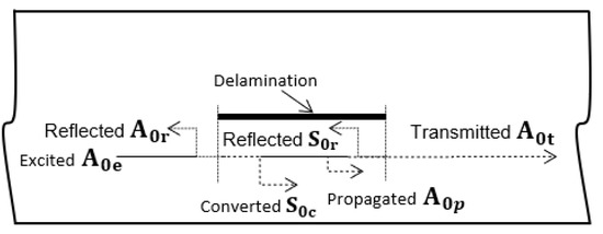 When the guided wave travels along the sample and encounters a delamination, part of excited mode is reflected at the leading edge of the delamination and part is converted to mode, as shown in Figure 6. A vertical, out-of-plane displacement component of the propagated wave was recorded in the study, as it is the dominant component of the A0 mode. Meanwhile, the vertical displacement component of the S0 mode is practically close to zero (see Figure 4). While traveling over the delamination, the converted mode was converted back to mode at the trailing edge of the delamination. Finally, strong reflected () and transmitted () modes were obtained after interacting with the delamination. Therefore, only reflected (A0r), and transmitted () modes can be observed in the B-scan images.