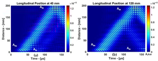 The B-scans of the response of the guided wave mode to delamination at different positions (40 and 120 mm) in the longitudinal direction are presented in Figure 7. The propagation time of mode varies when the delamination position changes.