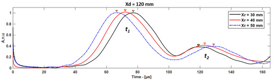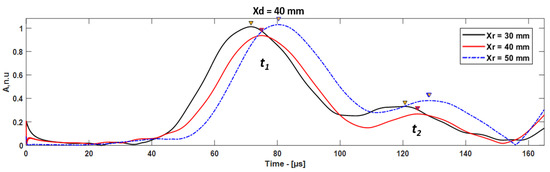 In the case of Xd = 120 mm, the guided wave signals were received at 70, 80, and 90 mm with respect to the leading edge of the CFRP plate. The distance between delamination and the receiver (Xdr) was 50, 40, and 30 mm. In this approach, if the delamination is located after the receiver position, the excited mode is received at the receiver as the first wave packet (t1) and the first reflection from the leading edge of the delamination is received as the second wave packet (t2) (Figure 1c), as shown in Figure 9.