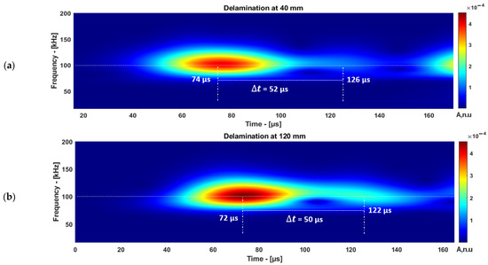 The inspection setup to estimate the delamination location is presented in Figure 1b,c. The ToF of reflected mode from different delamination locations in the time–frequency domain is presented in Figure 10a,b.