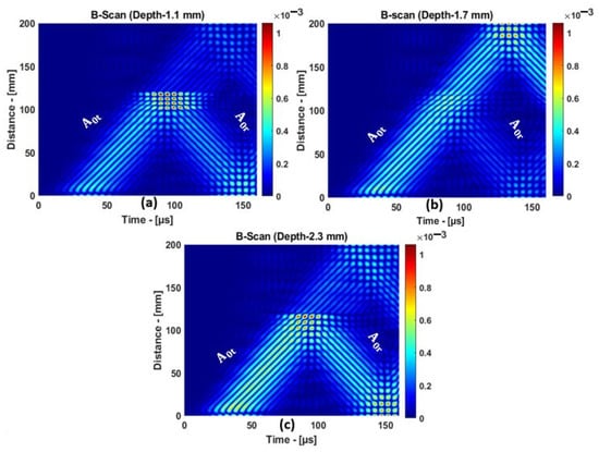 For 1.1 and 2.3 mm, the delamination was close to the top and bottom surfaces of the plate. For 1.7 mm, the delamination was right in the center of the plate. The B-scan representation of the mode response to delamination at different depths is presented in Figure 11a–c. From the B-scan results, strong reflections from the delamination positions at 1.1 and 2.3 mm can be observed. A weak reflection was observed when the delamination was positioned at 1.7 mm, i.e., in the middle of the sample.