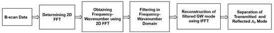 Initially, a two-dimensional fast Fourier transform (2D FFT) was applied to the B-scan data to obtain the wavenumber of the reflected and transmitted modes. The wavenumber of the signal using 2D fast Fourier transform can be expressed by the following equation [28]: