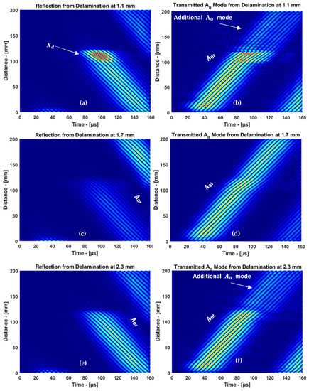 In the cases of delamination at 1.1 and 2.3 mm, the mode interacted with delamination and the top/bottom surface of the plate simultaneously. Therefore, an additional mode appeared in the transmitted mode, as shown in Figure 13b,f. In the case of delamination at 1.7 mm, there was a normal interaction with the top/bottom surface of the plate. Therefore, only the transmitted mode was observed. Thus, the signal processing method has shown a significant improvement to differentiate the additional mode obtained from the 1.1 and 2.3 mm delamination in the 3.5 mm CFRP plate.