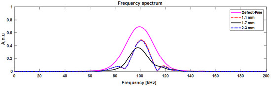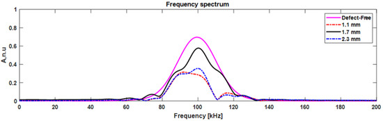 The frequency spectrum of reflected mode compared with the defect-free signal is presented in Figure 14. The reflected signal amplitude was reduced by 31% and 32% compared to the defect-free signal when the delamination was present near the top and bottom surfaces (at 1.1 mm depth), respectively. It is an indication of strong reflection, and is due to the delamination edge and surface of the CFRP plate. It is important to note that the delamination position at 1.1 and 2.3 mm has the same distance from the top/bottom of the plate. Therefore, the amplitude of the reflected mode is similar. In the case where delamination presented at the center (1.7 mm) of the plate, the signal amplitude was reduced by 48%. When mode propagated over the delamination without the interference of the boundaries, a weak reflection occurred.
