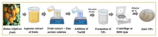 ZnO-NPs were prepared from the fruit’s aqueous extract of R. ellipticus by following the method of Chauhan et al. [27]. For the preparation of ZnO-NPs, the 10 mL of fruits aqueous extract (100 mg of fruits’ aqueous extract in 10 mL of distilled water) was mixed with 50 mL of zinc acetate dihydrate (0.5 M; Loba Chemie, Mumbai, India; 98% purity) in a beaker (Figure 1). To the solution, 5 mL of sodium hydroxide (0.2 M) was added, and the whole solution was magnetically stirred for 20 min. at 40 °C temperature. The whole solution was magnetically stirred for 20 min. at a temperature of 40 °C. The resulting solution in the flask was stirred for two hours until white precipitates formed. The precipitates were collected, centrifuged, and washed with deionized water for the removal of impurities. The sample was collected and then dried at 60 °C for 24 h.