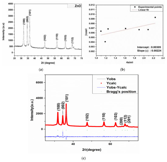 (a) XRD pattern, (b) W-H plot, and (c) Rietveld refined pattern of ZnO-NPs.