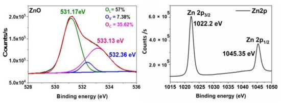 The chemical bonding states of the elements of ZnO-NPs were determined using the XPS spectra. Figure 3 shows the O1s and Zn2p core-level XPS spectra of ZnO-NPs. The asymmetric O1s peak was deconvoluted into three different peaks at 531.17 eV, 532.26 eV, and 533.13 eV, which corresponds to the oxygen ions associated with the lattice oxygen of ZnO structure, oxygen vacancies, and chemisorbed oxygen species [40,41]. The chemisorbed species plays a major role in enhancing the antimicrobial and photocatalytic degradation properties [27,39]. In Zn2p core-level XPS spectra shows two symmetrical peaks at 1022.2 eV and 1045.35 eV are ascribed to Zn2p1/2 and Zn2p3/2. The given value of binding energy is in good agreement with the previously reported data for the Zn2+ oxidation state [42].