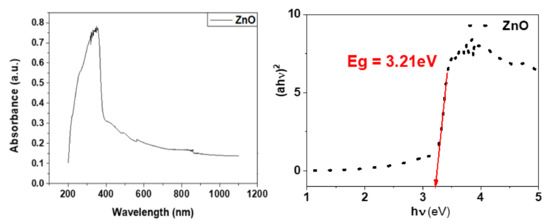 Figure 4 shows the UV absorbance spectra and Tauc’s plot for the determination of optical bandgap. It can be observed that the absorption spectra of the synthesized ZnO-NPs exhibit a strong absorption band at 353 nm. The excitonic absorption peak can be observed at 257 nm, which is a result of the lower bandgap wavelength of ZnO-NPs than 358 nm [43]. The direct energy bandgap (Eg) that turned out to be 3.21 eV for the synthesized ZnO-NPs was determined using the Tau’s relation [44]: