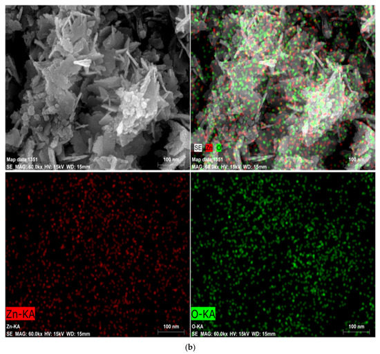 The FE-SEM images given in Figure 5a reveal the self-assembly of spherical particles to form a flower-like structure and are arranged uniformly. The agglomeration of larger assembled structures can be observed. Figure 5b shows the elemental distribution of ZnO-NPs, which reveals the uniform distribution of zinc and oxygen in ZnO-NPs. The surface area of nanoparticles is much higher than their bulk counterparts, which allows them to have more molecules on the surface of the nanoparticles. This provides the nanoparticles with their special properties due to their surface chemistry as a photocatalyst and an antimicrobial agent. The plant extract could have played a relevant role as a capping agent and prevented the agglomeration of nanoparticles [39,45].