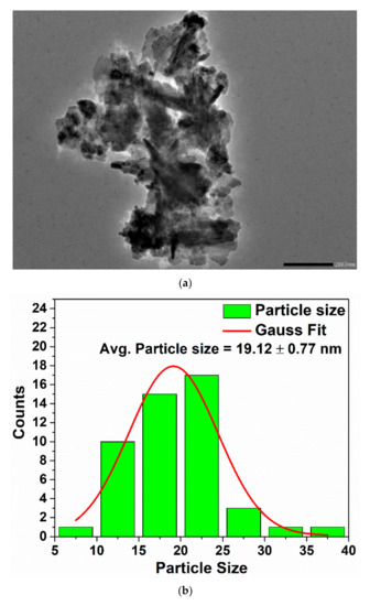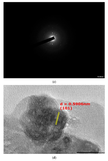 The TEM images reveal the formation of self-assembled grains with irregular shapes and size. It can be observed that the smaller grains diffused to form larger grains. The particle size distribution given in Figure 6b with average particle size of 19.12 ± 0.77 nm was obtained using ImageJ software and origin software. The d-spacing of 0.5906 nm was calculated using ImageJ software from the observed lattice spacing corresponding to (002) hkl plane (Figure 6d). The SAED pattern showed the presence of circular rings with bright spots which correspond to the polycrystalline nature of the ZnO-NPs (Figure 6).