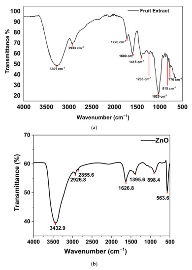 The Fourier transform infrared spectroscopy (FTIR) is carried out to study the chemical bonds in a molecule by generating the infrared transmittance spectrum. The molecular fingerprint design was used to investigate the different compounds present in the sample. The fingerprint region in the range of 1500–500 cm−1 is distinctive for every sample and the region in the range between 4000 to 1500 cm−1 is the functional group region. Figure 7 represents the FTIR spectrum of fruit extract and green-synthesized ZnO-NPs to identify the functional groups of phytochemical molecules. The synthesized ZnO-NPs exhibited strong bands at 3432, 2926, corresponding to O–H, N–H stretching vibrations of carboxylic acids, alcohols, amide, respectively. The absorption peaks at 1626 and 1395 cm−1 owing to the –C=C– and C–N stretching vibrations of aromatics and aromatic amines [46]. The absorption bands at 898 cm−1 and 563 cm−1 confirmed the formation of metal oxide [47]. The strong band stretching absorption peaks around 3200–3300 cm−1 was assigned to strong band interrelated overlapping stretching vibration of the amide (N–H) and hydroxyl group (OH) in the fruit extract. The OH group stretching indicated the presence of alcohol and phenol and also probably includes the N-H group of proteins [15,48,49]. The fruit extract showed the presence of phytochemical compounds (phenols, glycosides, tannins, saponins, and flavonoids) in R. ellipticus [25,26] that facilitate the formation of ZnO-NPs by acting as a capping, reducing, and stabilizing agent [15,27]. The analysis of peaks was in accordance with an earlier study of green synthesis of ZnO-NPs using different extracts [27,46,47].