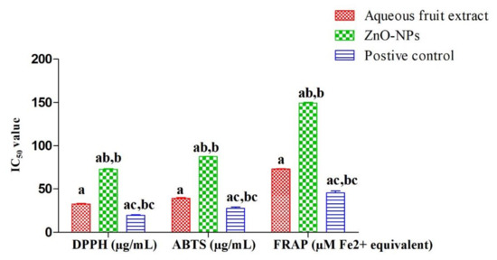 In vitro antioxidant potential (IC50 value) of zinc oxide nanoparticles and fruit extract [Different superscript showed significant (p < 0.05) difference between (a) fruit extract, (b) ZnO-NPs and (c) positive control between plant extract and nanoparticles].
