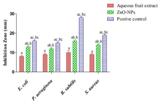 Antibacterial activity of aqueous extract and ZnO-NPs against pathogenic bacteria [Different superscript showed significant (p < 0.05) difference between (a) fruit extract, (b) ZnO-NPs, and (c) positive control].