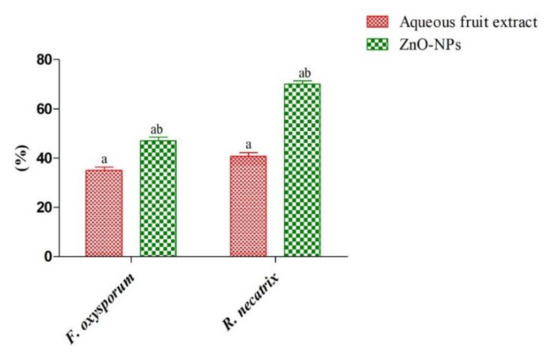 The antifungal activity of fruit aqueous extract and ZnO-NPs was determined by the food poison technique against two fungal strains (F. oxysporum and R. necatrix) and further confirmed with MIC value. As shown in Figure 10, ZnO-NPs showed a significantly (p > 0.05) higher percent of inhibition of R. necatrix (70 ± 1.4%) and F. oxysporum (47 ± 1.6%) compared to the fruits aqueous extract (40.8 ± 1.4% and 35 ± 1.4%, respectively) (Figure 10 and Figure S2). Chauhan et al. [27] observed 47% and 26% percentage inhibition of ZnO-NPs for F. oxysporum and R. necatrix, respectively. On the other hand, Yehia and Ahmed [61] in their study also observed good antifungal activity of ZnO-NPs against F. oxysporum and Penicillium expansum.